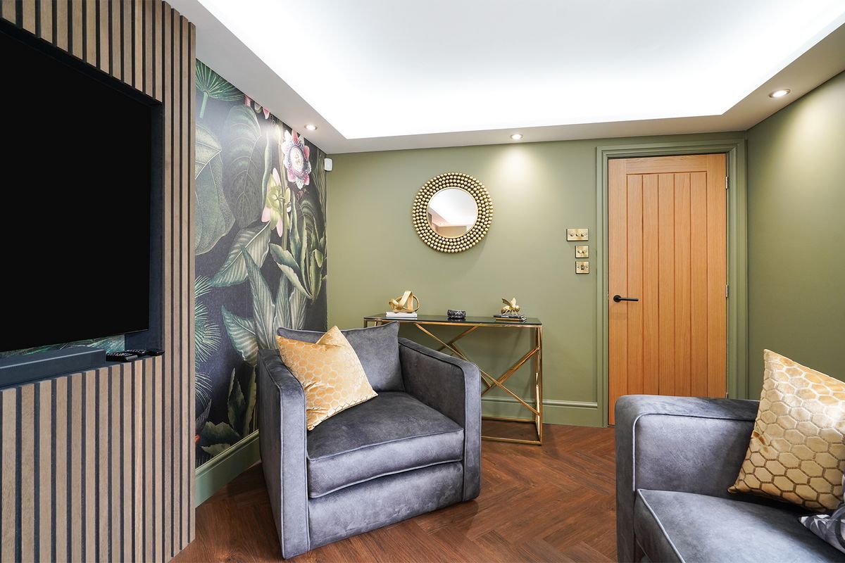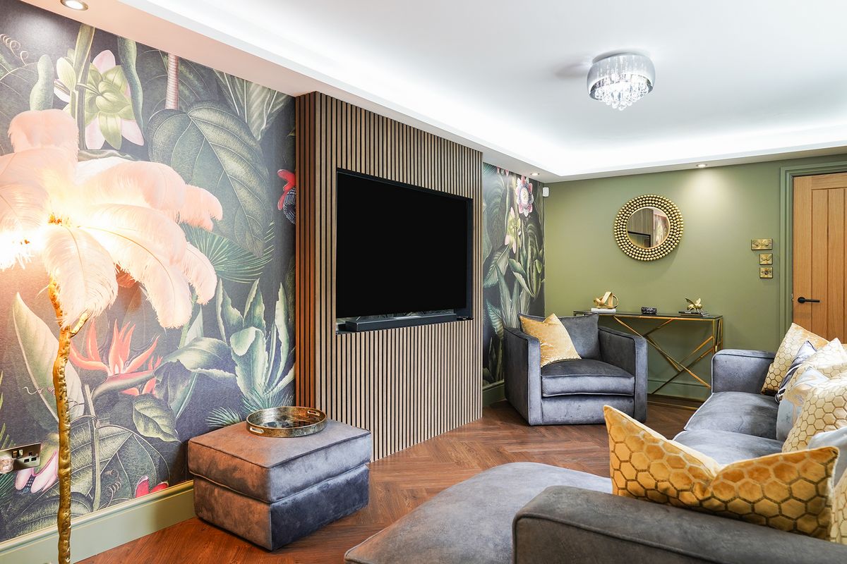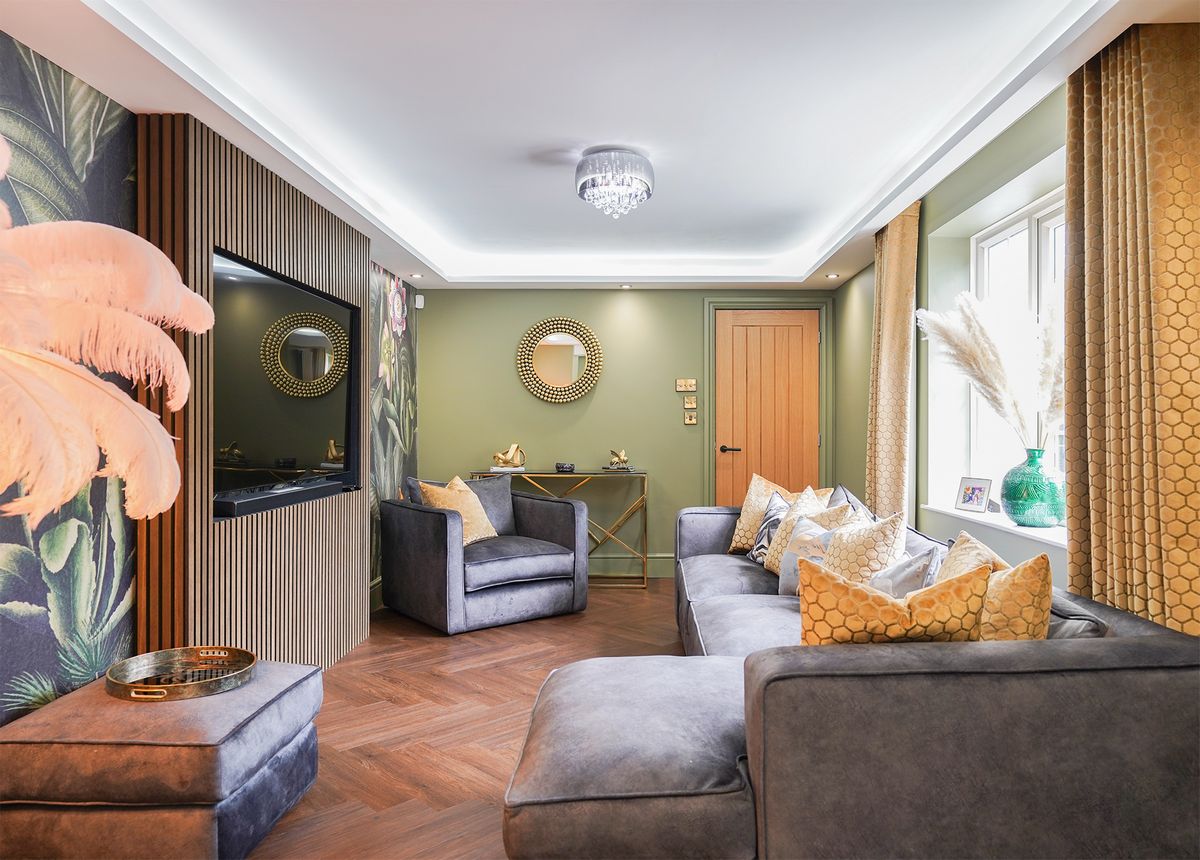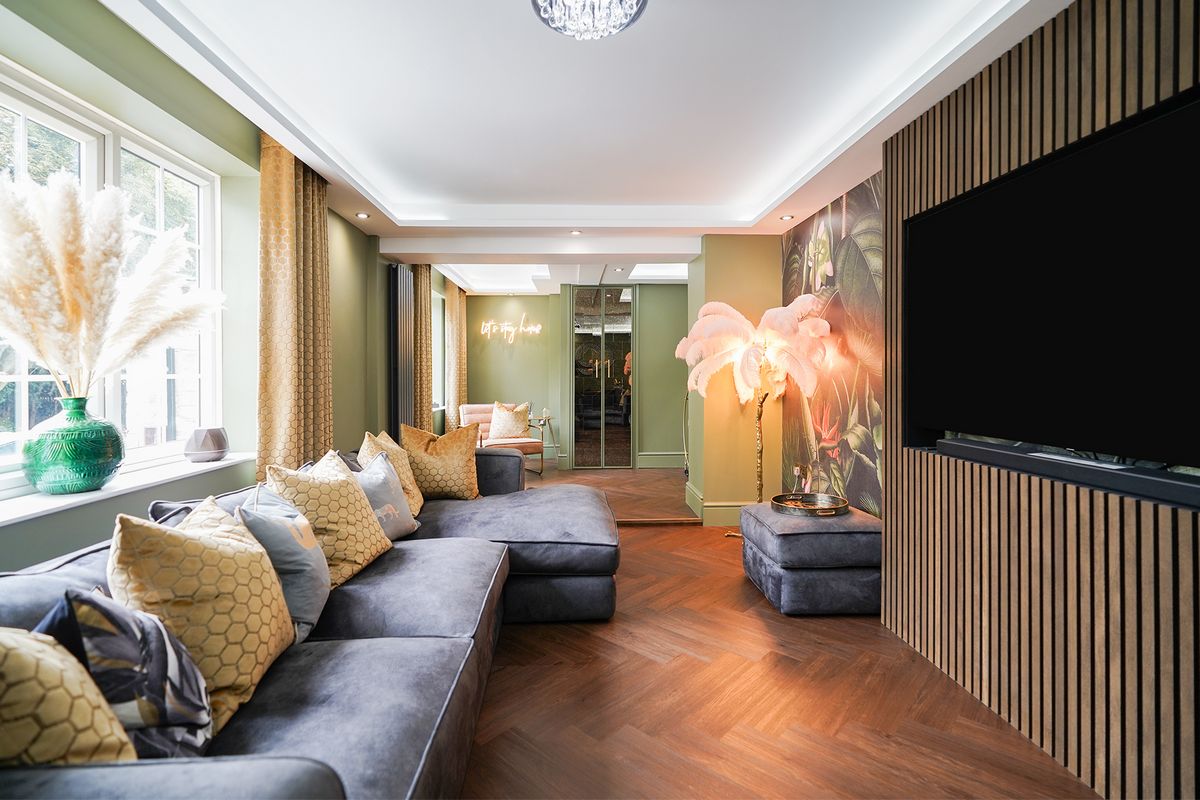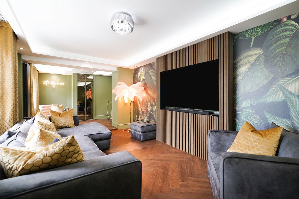 The client utilised our premium service which was everything from conceptual mood boards through to putting the last vase in place. I started with the mood boards and spatial planning, with the room being long and narrow with a low ceiling, its important to try to open up the space, whilst adding layers through lighting to create a different feeling and utilise mood lighting too. In creating the ceiling coffer gave the room layers with lighting combined with floor to ceiling curtains actual makes the room look taller. Having a statement media wall helped to give the impact statement when you walked into the room and a good way to conceal wires and sockets too with the nature wall section. The herringbone bone style evocore flooring helped to widen the room and ran throughout from the hallway. Sofas and chairs were made bespoke through us as were all the soft furnishings, fabric selection is really important too. With the fabrics selected they were all soft touch materials to give that luxury feel. Its fair to say the client loved the result as you can see from their testimonial and then we went onto do their hall stairs and landing too.