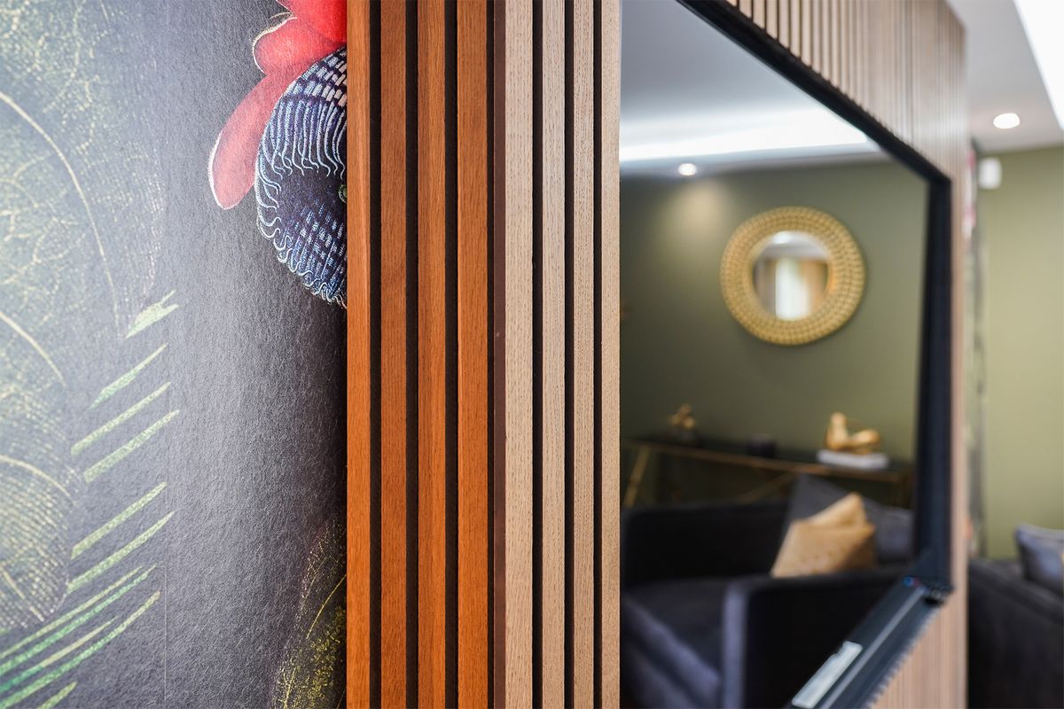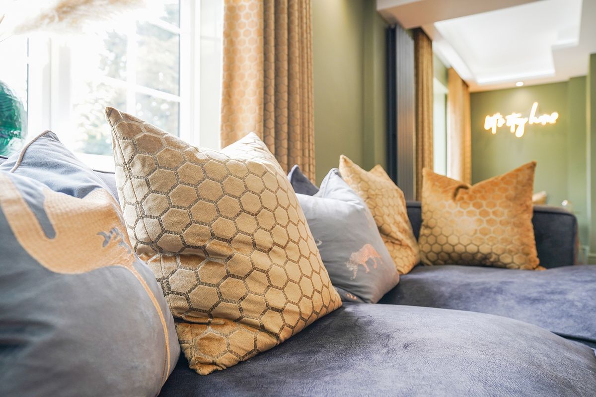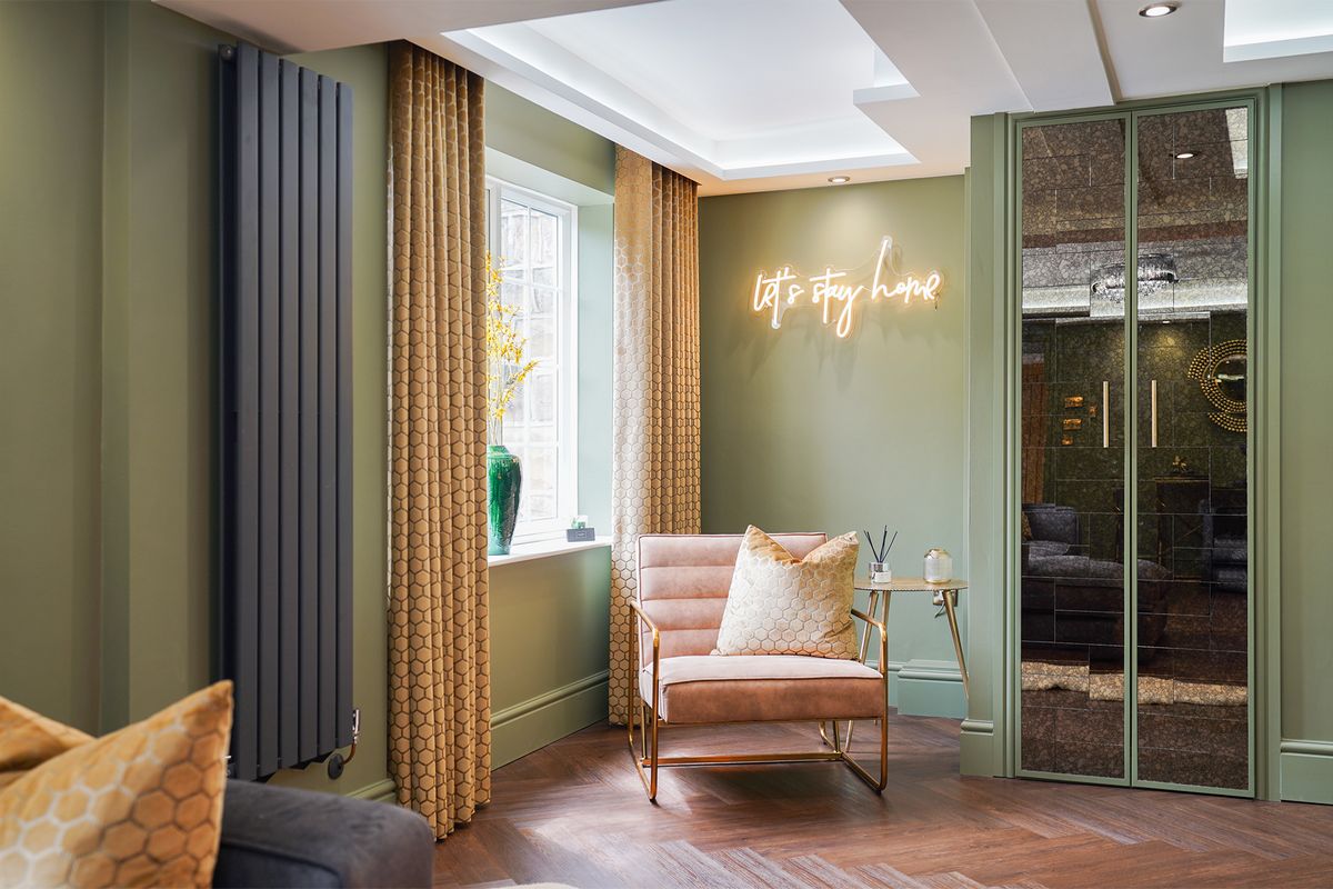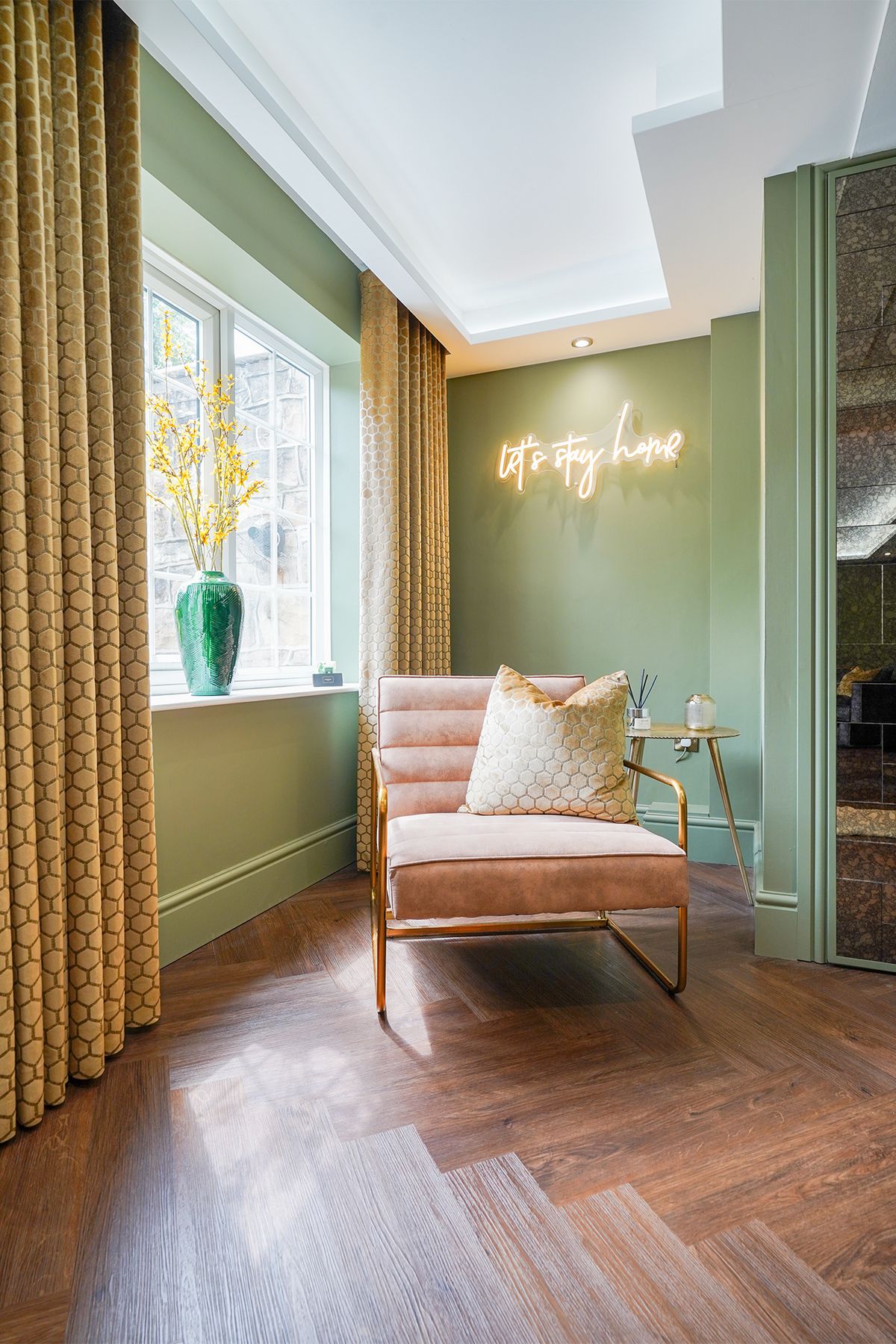The client utilised our premium service which was everything from conceptual mood boards through to putting the last vase in place. I started with the mood boards and spatial planning, with the room being long and narrow with a low ceiling, its important to try to open up the space, whilst adding layers through lighting to create a different feeling and utilise mood lighting too. In creating the ceiling coffer gave the room layers with lighting combined with floor to ceiling curtains actual makes the room look taller. Having a statement media wall helped to give the impact statement when you walked into the room and a good way to conceal wires and sockets too with the nature wall section. The herringbone bone style evocore flooring helped to widen the room and ran throughout from the hallway. Sofas and chairs were made bespoke through us as were all the soft furnishings, fabric selection is really important too. With the fabrics selected they were all soft touch materials to give that luxury feel. Its fair to say the client loved the result as you can see from their testimonial and then we went onto do their hall stairs and landing too.