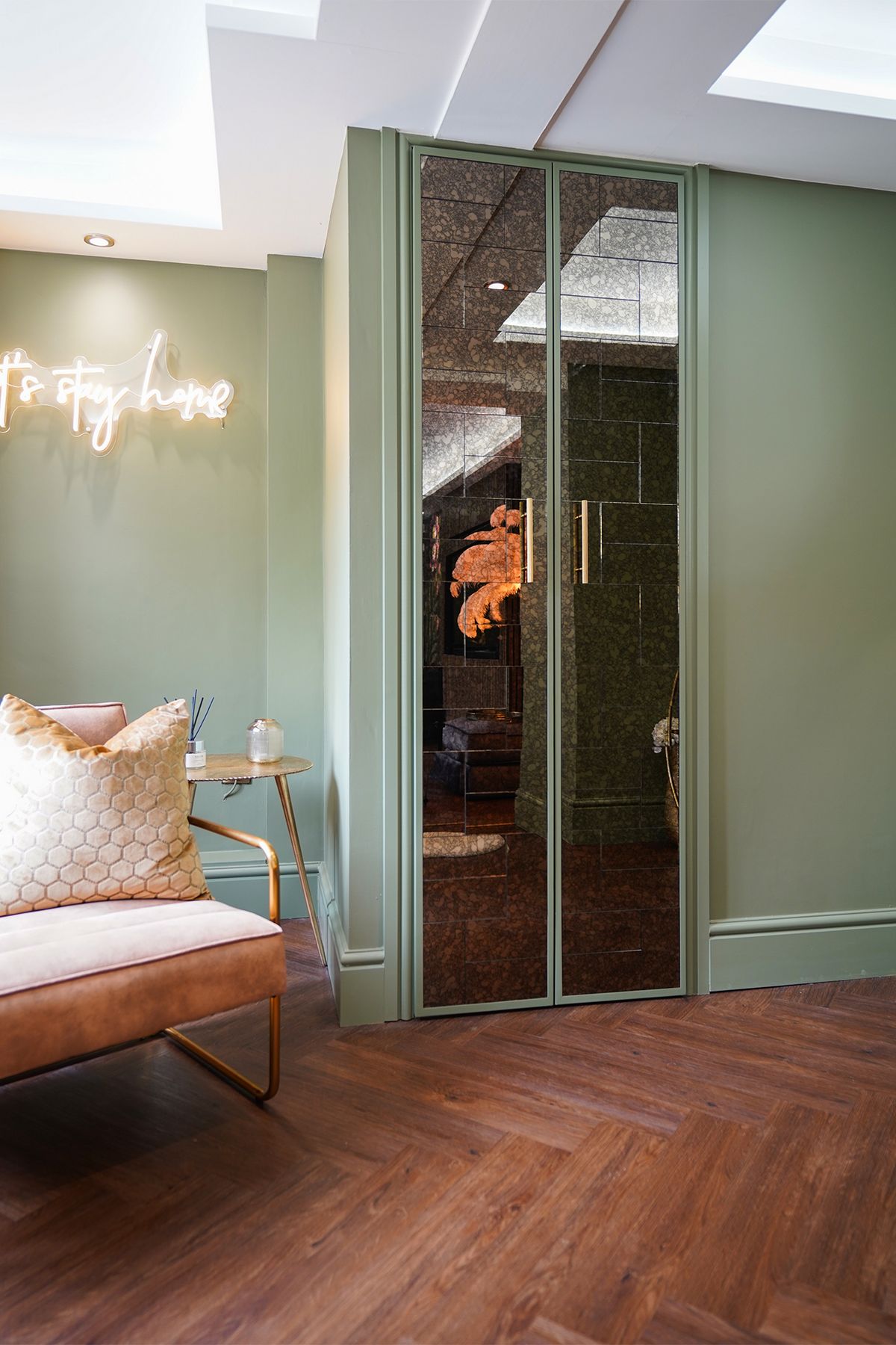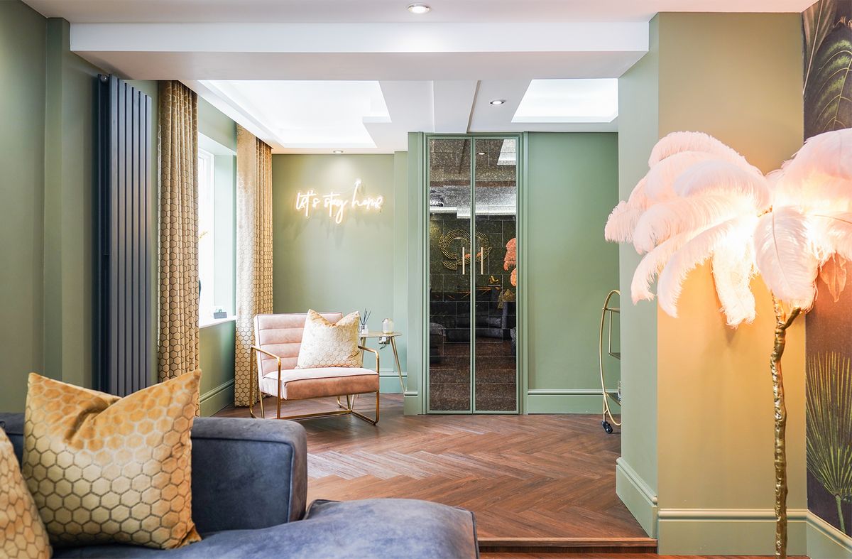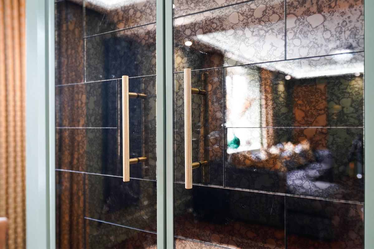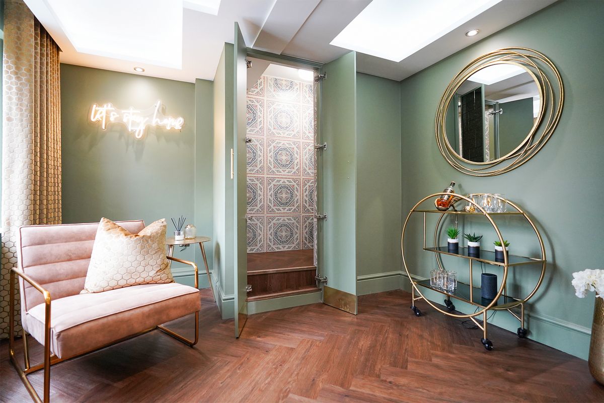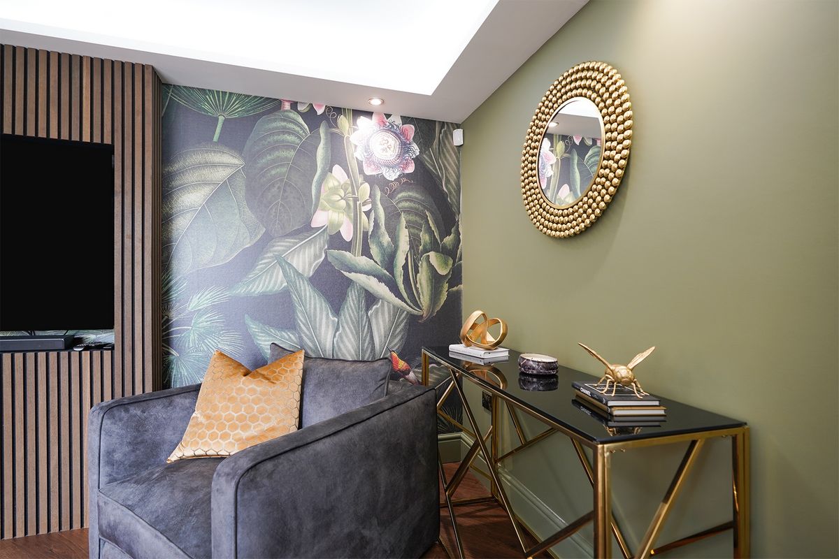 To create a boutique hotel-inspired feel room but not something traditional. The room was narrow and long, my client wanted somewhere to sit and relax, but also a space to entertain friends and create some storage was required. My client loved deco a little maximalism too, but had never liked curtains or green.