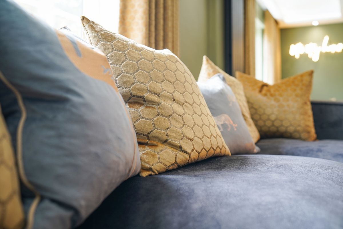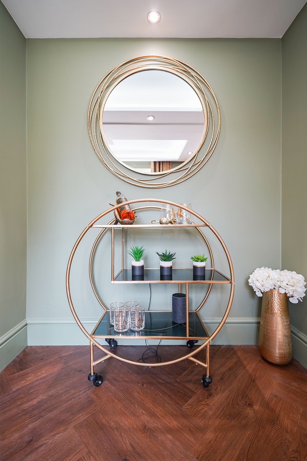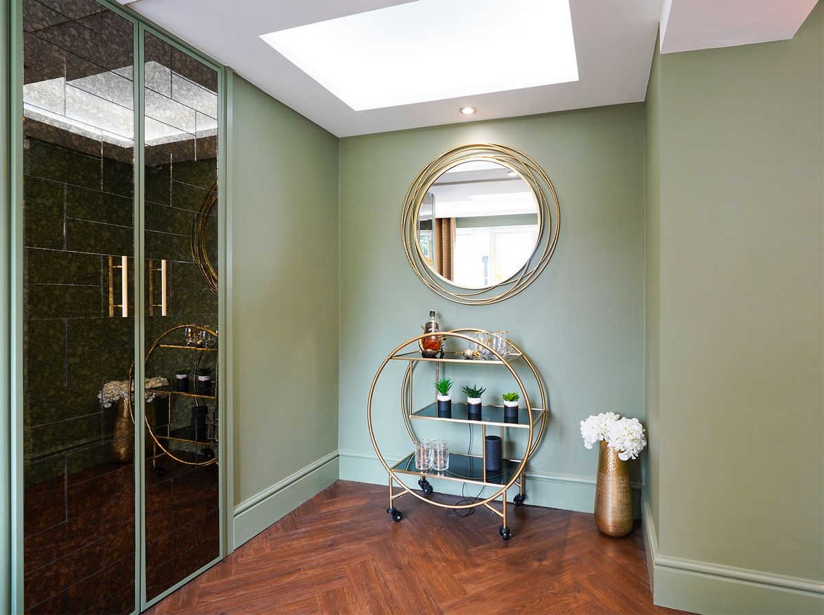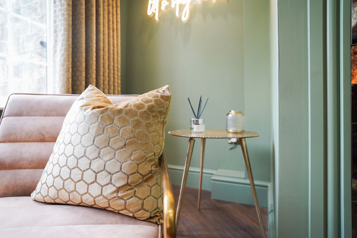 To create a boutique hotel-inspired feel room but not something traditional. The room was narrow and long, my client wanted somewhere to sit and relax, but also a space to entertain friends and create some storage was required. My client loved deco a little maximalism too, but had never liked curtains or green.