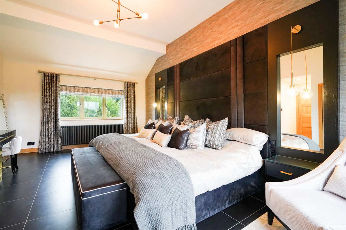 The client utilised our design consultation service as well as bespoke furniture and styling. We designed a bespoke 3m bed with headboard (this was two double beds to help put this into context) a blend of squares and rectangles for the headboard with bespoke floating bedsides with mirror and lighting. We also designed and had two lounge chairs made and finished the room with soft furnishings, curtains, cushions and an ottoman for extra storage for bedding. Adding some bedside lights hung from the wall, a statement pendent with an oversized mirror helped to complete the look overall.