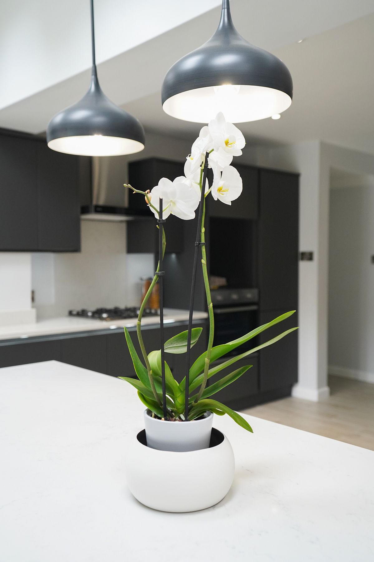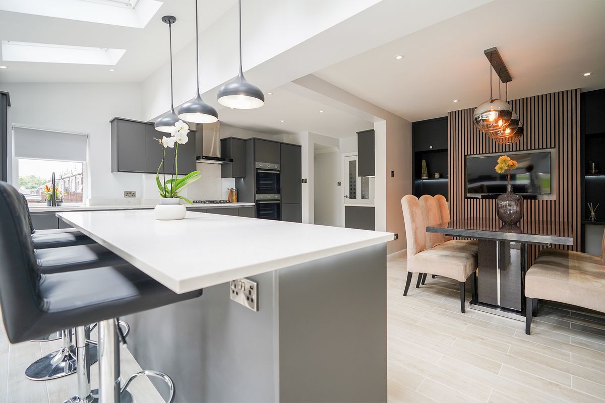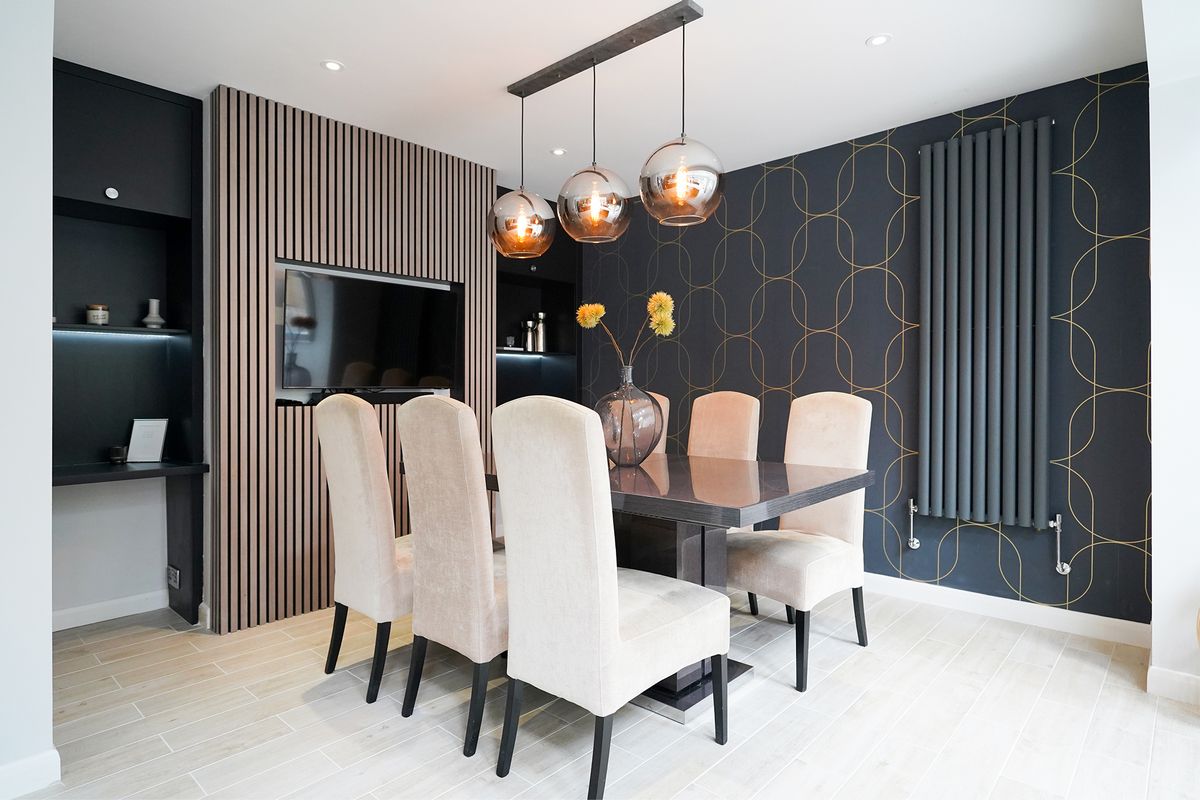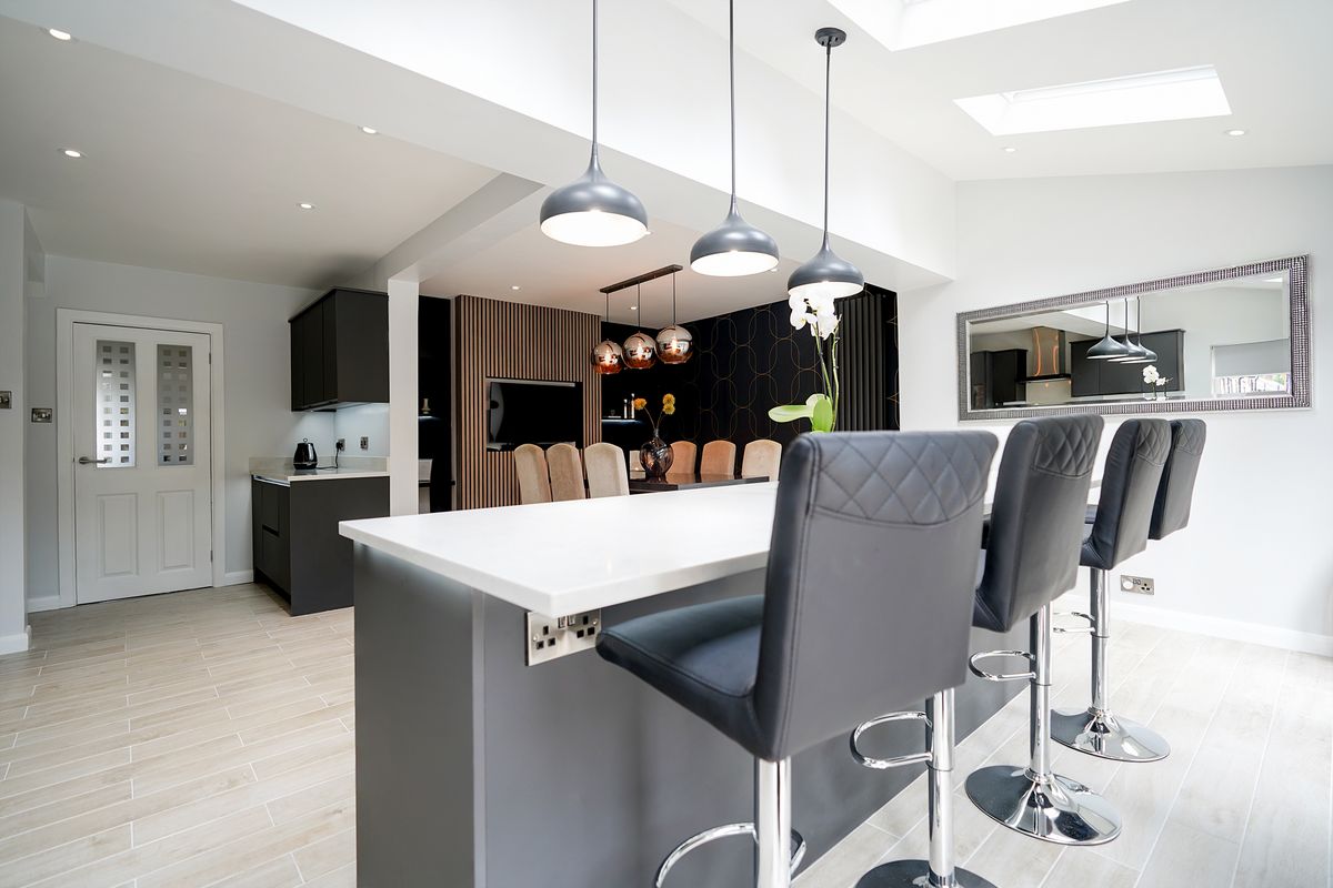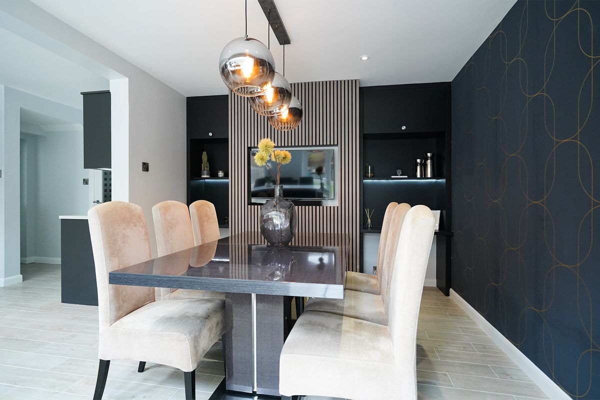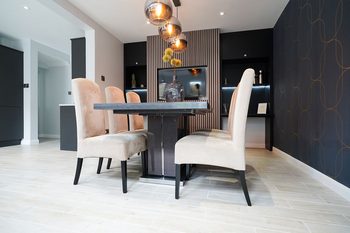 Utilising our premium service we provided the full elements taking away the stresses and time for the client. We created a kitchen that provided all elements the client wanted and a little extra. A key thing being storage, having a large island added was great for solving this challenge, we included a larger sink for those large pans to actually fit in. Having adjustable bar stools so the children could sit at the island for more relaxed eating, whilst having a dedicated area that was for family meals at the dining table. To add contrasting materials and textures in adding the small media wall and bespoke cabinetry for storage either side not only looked great but practical too. Managing the whole process from rip out, spatial planning, design, lighting to putting in those finishing elements in place - the colouring books on the children’s desks of course.